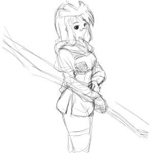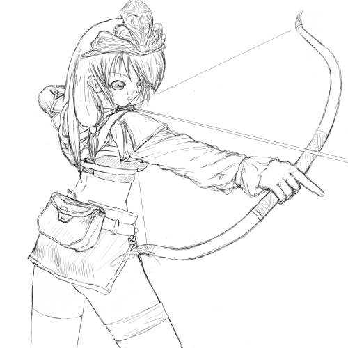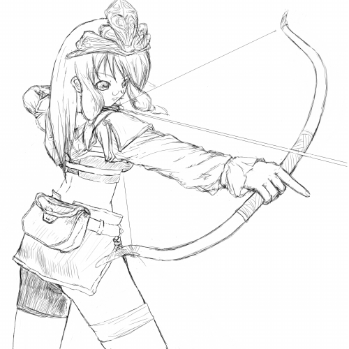 右のSSは、既出のやつを描くちょっと前に、かなり適当にだだーっと描いたラフなんですけど、やっぱりこれくらいの大きさが欲しいですね、弓。