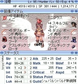 Dex は弓装備の時は10の倍数毎にAtkにボーナスがちょっとつくので、頭装備を矢リンゴにすることで調整。うさ耳にこだわるときは服をゴキタイツにしてアクセの一つをニングロにすればDexは110になるんですけど、現在の髪型なら矢リンゴ着けてもそんなに嫌いな見た目じゃないから良し。