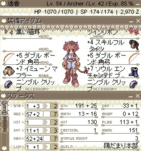 倉庫の中に、洛姫転生の時にいっぱい貰った風矢が残っていたのでここでの育成もサクサク。あっという間に角弓装備可能なベース33到達。