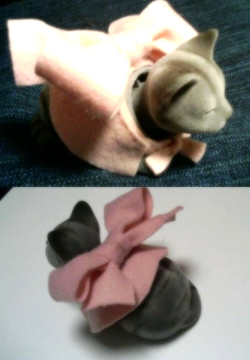 で、せっかくなのでリボンを新調してあげようかというわけで、100円ショップへ走った私。あ、新調というからには、それまでも自作のリボンを巻いてあげていたのですよ? 鈴付き。