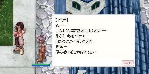 と、言うわけで、今日ROに入って最初にやったのは、忍者用の装備がないかな~とプロの街中をうろうろすることだった洛姫でした。ひゃっほぅ。